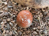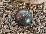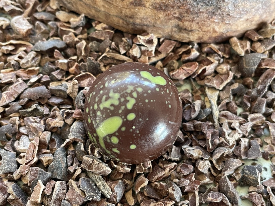 Hausgemachtes Pistaziennougat mit getrockneten Himbeeren in einer aus seltenem Wildkakao und Bergmilch bestehenden 45% Kuvertüre.